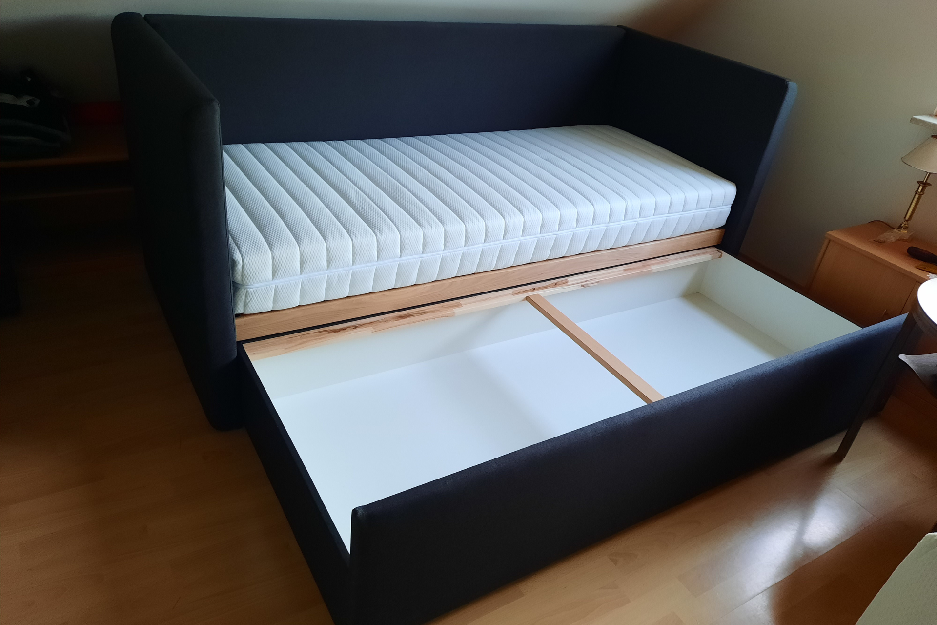Je trekt de bedlade eruit, legt de lattenbodem en matras erop, en voilà – Je tweepersoonsbed is klaar.